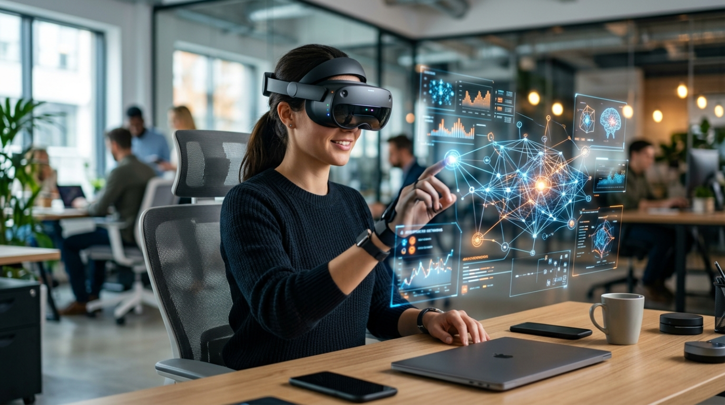 Spatial computing has become a standard personal workstation. You can take your entire office, with multiple giant screens, and pin them to the walls of a hotel room or a coffee shop. Over 25% of people now spend at least an hour a day in these virtual environments.